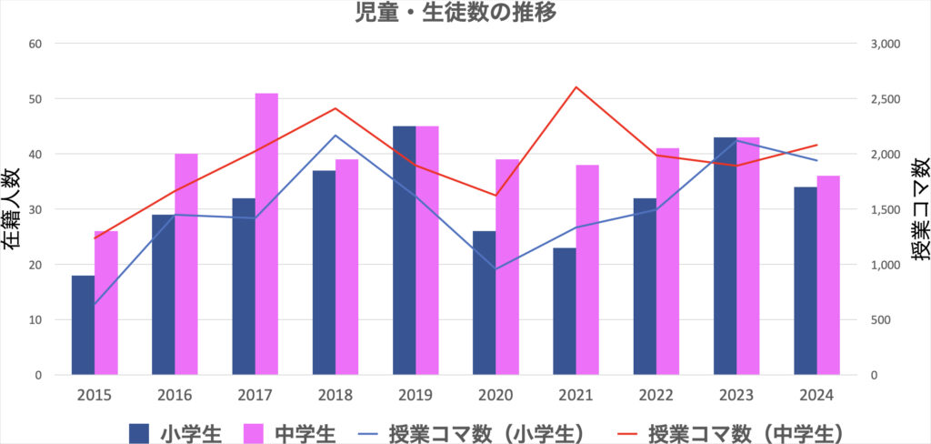 授業形式としては、各地区、小中学生とも基本、対面授業で行い、一部中学生に関してはオンライン授業で対応した。