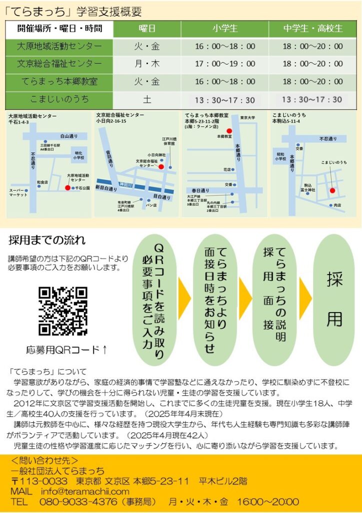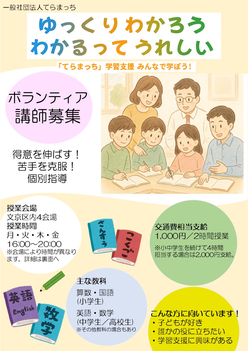 「てらまっち」では、常時ボランティア講師、事務スタッフを募集中です。お気軽にお問い合わせください。