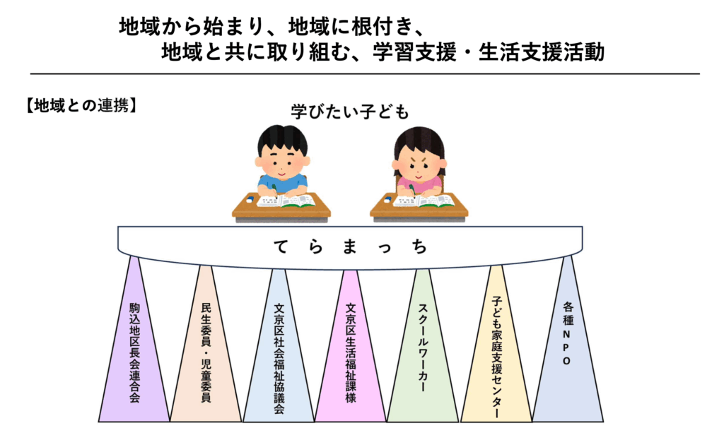 一人の区民の「手弁当」から始まった取り組みは、地域に根づき、地域と共に歩みながら14年を重ねてまいりました。これまで、講師スタッフを担ってくださった地域の皆さまや大学院生・大学生の皆さま、地域の児童・生徒に関する相談にご尽力いただいた民生委員・主任児童委員の皆さま、そして地域全般の課題解決に寄り添ってくださった文京区社会福祉協議会・地域福祉コーディネーターの皆さまに、深く感謝申し上げます。